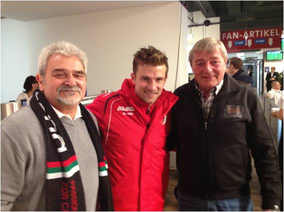 Seinen Hauptpreis, den er bei der Weihnachtstombola des FC Horgau gewonnen hatte, konnte unser 3. Vorstand Dieter Zeller gleich beim 1. Heimspiel des FCA nach der Winterpause gegen Schalke 04 einlösen. Er und sein Freund und Sportskamerad aus gemeinsamen Fußballerzeiten Gerhard Vietz wurden vom Sponsor des Preises Edgar Schmid (KfZ-Handlung) in den VIP-Bereich der SGL-Arena eingeladen. Dort konnten die beiden nicht nur das Spiel verfolgen sondern auch für das leibliche Wohl war gesorgt und zum Abschluss gab es noch die eine oder andere Begegnung mit FCA-Größen wie Trainer Markus Weinzierl, Stürmer Sascha Mölders oder auch Kapitän Daniel Baier, wie auf dem Bild zu sehen ist.
