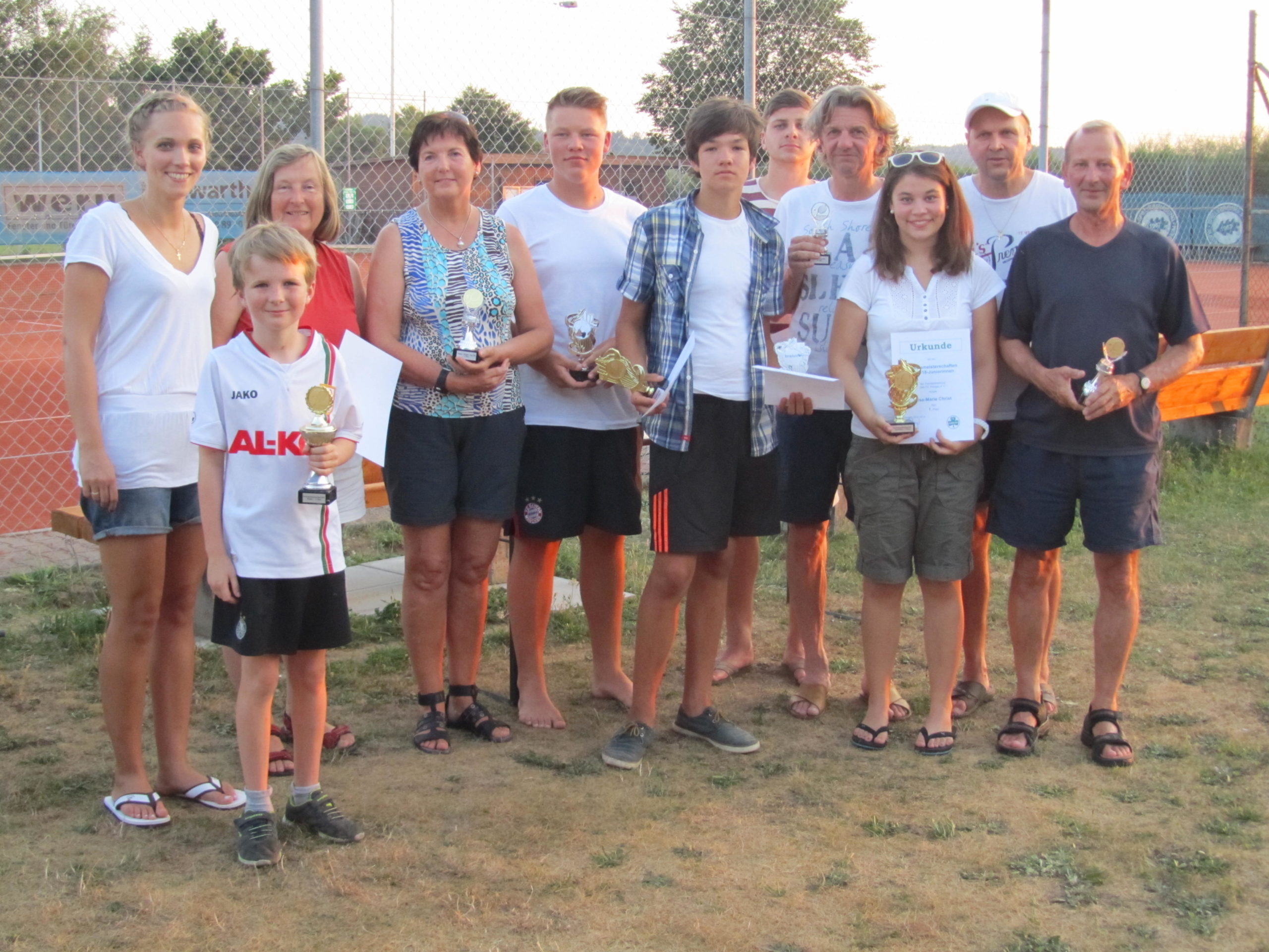 DSCN6352Die diesjährigen Endspiele der Tennisvereinsmeisterschaften des FC Horgau wurden unter extremer Hitze am letzten Juli-Wochenende ausgetragen. Nach mehr als zehn Jahren konnte sogar wieder unter den Kindern ein Meister ermittelt werden. Stolz belegte Christian Weishaupt den ersten Platz vor Ben Thanner, Svenja Mair (3.), Niklas Müller (4.), Felix Schmuttermair (5.) und Amon Mair (6.) Bei den Juniorinnen konnte sich Lisa-Marie Christ glatt in zwei Sätzen gegen Magdalena Wieland durchsetzen. Den dritten Platz sicherte sich Celine Steinle vor Rebecca Wawatschek, Leonie Kuen und Louisa Tögel. Bei den Junioren siegte Tim Wieland vor Julian Christ und Valentin Blochum. Beim alljährlichen Frauen-Doppel-Cup gewann zum wiederholten Male Elfriede Drexel vor Helga Zimmermann, Maria Burkert und Renate Singer. Beim Herren-Cup musste sich Werner Weishaupt dem Titelverteidiger Georg Schwarzmann mit 7:5 und 6:2 geschlagen geben. Den dritten Platz belegte Willi Bracke vor Werner Egle. Im spannendsten Spiel des Tages, den Vereinsmeisterschaften der Männer, unterlag Philipp Egle nur ganz knapp Fabian Tögel Im Match-Tiebreak mit 10:7 nachdem jeder der beiden Finalisten zuvor einen Satz für sich entscheiden konnte. Dritter wurde Patrick Steinle vor Michael Singer. Bei der abschließenden Siegerehrung bedankte sich Abteilungsleiter Jürgen Tögel bei allen ehrenamtlichen Helfern, insbesondere bei den beiden Platzwarten Johann Drexel und Georg Schwarzmann, für ihr Engagement im abgelaufenen Jahr mit einem Geschenk.