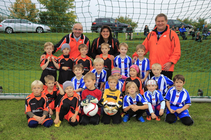 Im ersten Testspiel der Saison traten die kleinsten Kicker der Spielgemeinschaft gleich mit zwei kompletten Mannschaften gegen den TSV Welden an.  In jeder Halbzeit spielte unsere Mannschaft mit einem anderen Team. Den schnellen 0:1-Rückstand glich Daniel Gruber gekonnt zum 1:1 aus. Das Spiel wirkte  sehr ausgeglichen und beide Mannschaften hatten mehrere Torschussgelegenheiten um in Führung zu gehen, aber in der 1.Halbzeit  fiel nur noch der  Gegentreffer zum 1:2. In der 2. Halbzeit konnten wir  sogar etwas Druck auf dem Gegner aufbauen und hatten auch einige Torchancen, die unsere Jungs leider nicht verwerten konnten. Aber der TSV Welden blieb durch seine Konter stets gefährlich und erzielte noch 4 Treffer zum 1:6 Endstand. Trotz Niederlage waren die Betreuer höchst zufrieden mit der Leistung ihrer beiden Mannschaften! Unser Bild zeigt die beiden Mannschaften mit den Betreuern hinten von links: Roland Frisch, Brigitte Wieland und Johann „Hambo“ Hampp.