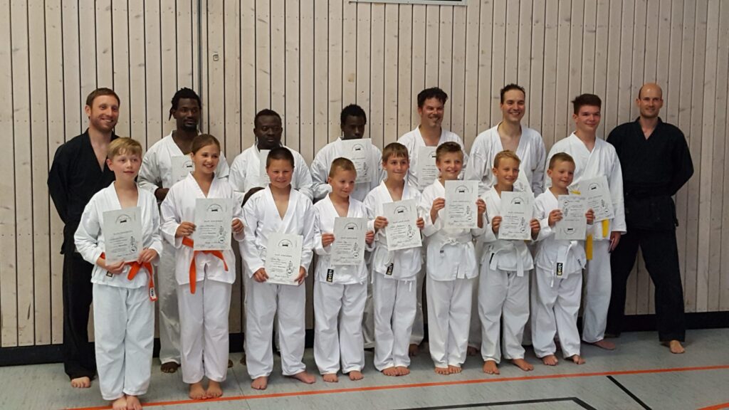 Vor allem den Sportlern, für die es die erste Prüfung war, konnte man die Nervosität anmerken. Durch die Routine der Schlag- und Kicktechniken, sowie der Fallschule, gewannen sie aber schnell an Sicherheit. Besonders stark waren alle Allkämpfer bei der Abwehr von verschiedenen Angriffssituationen. Sie ließen sich nicht aus der Ruhe bringen und meisterten alle Aufgaben einwandfrei.