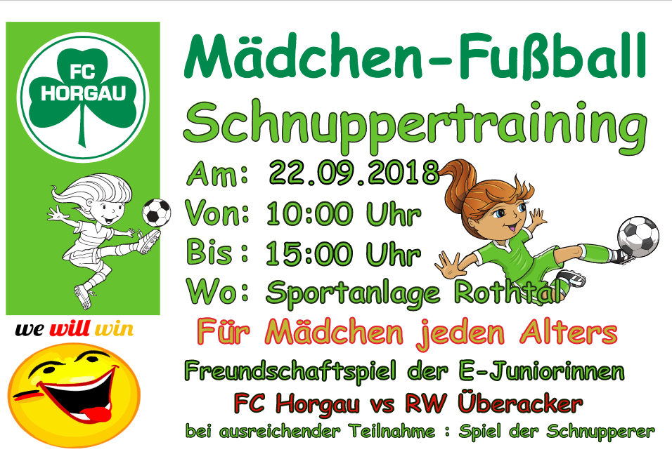 Der FC Horgau lädt ein zum Mädchen-Fußball Schnuppertraining. Es findet am 22.09.2018 von 10:00-15:00 Uhr statt. Mädchen jeden Alters sind herzlich Willkommen.