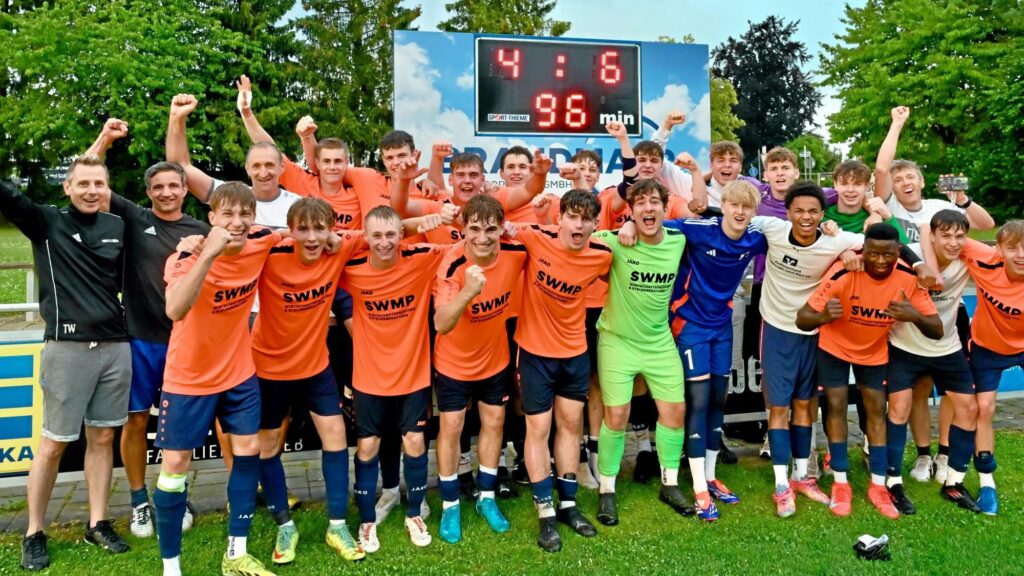 Vor fast 300 Zuschauern in Thierhaupten fand das Finale zwischen der (SG) Ustersbach und unserer (SG) Dinkelscherben/Auerbach/Horgau statt. Diese sahen ein spannendes Spiel mit insgesamt 10 Toren. In der 7. Minute konnten die Mannschaften und Fans zum ersten Mal jubeln, als die SG zum ersten Mal durch Raffael Vogg traf. Das Spiel blieb spannend und kurz vor der Halbzeitpause konnte die SG Ustersbach (bestehend aus Ihren Partnervereinen Anhausen, Gessertshausen, Margertshausen und Fischach) das Spiel durch zwei Treffer in der 38. und 44. Minute zu Ihren Gunsten wenden. Nach der Halbzeitansprache des scheidenden Trainers Thomas Wagner ging es spannend weiter und unser Team hatte nun deutlich mehr vom Spiel und konnte durch Einzelleistungen von Noah Hagner, der seinen Mitspieler in der 56. Minute glänzend freispielte und Ibrahim Camara bediente. In der 60. und 71. Minute konnte Emmanuel Seibold die Partie wieder zu Gunsten der Dinkelscherber SG drehen. Danach dachten viele der mitgereisten Fans, dass sie nun den Sieg in der Tasche hatten, lagen aber falsch, denn in der 72. Minute konnte Ustersbach durch den zweiten Treffer wieder verkürzen. Kapitän Vincent Zott sorgte jedoch für unsere Mannschaft in der 79. Spielminute wieder für Erleichterung. Als Roland Ammann kurz vor Schluss auf 6:3 erhöhte, war der Bann dann gebrochen. Den Endstand zum 6:4 konnte die SG Ustersbach noch in der Nachspielzeit herstellen.