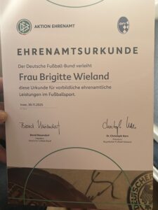 Auf dem diesjährigen Ehrenamtstag in Kloster Irsee hat Frau Brigitte Wieland vom FC Horgau eine besondere Wertschätzung des Deutschen Fußballbunds und Bayerischen Fußballverbands erhalten und wurde mit dem DFB-Ehrenamtspreis 2025 ausgezeichnet.