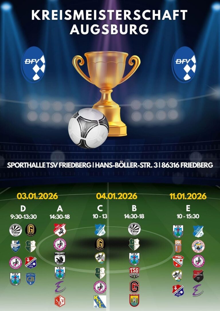Ebenso erreichten unsere erfolgreichen A-Junioren nach dem Landkreispokalsieg im Freien das KreisfinaleAugsburg in Friedberg – und das mit nur einem Hallentraining im Vorfeld! Wir bitten auch bei unseren A-Junioren um zahlreiche Unterstützung in der Sporthalle des TSV Friedbergin der Hans-Böller-Straße…
